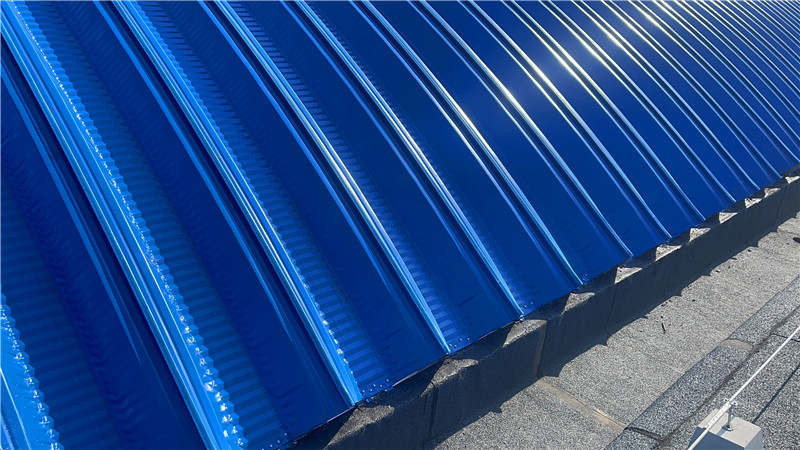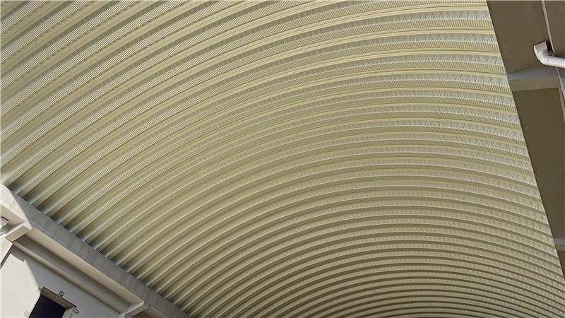 本次拱形波紋鋼屋面采用914-610型結(jié)構(gòu),拱跨18.10米,長度85.82米,總覆蓋面積超1500㎡。屋面選用冠洲品牌彩涂卷,厚度1.0mm,正面海藍(lán)色、背面灰白色,兼顧耐腐蝕性與視覺協(xié)調(diào)性。