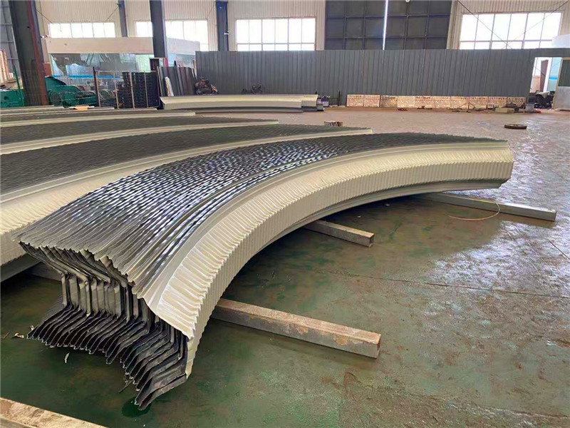 本次拱形屋頂單元板工程主要服務(wù)于某出口型廠房的建筑改造升級(jí),客戶對(duì)結(jié)構(gòu)穩(wěn)固性、現(xiàn)場(chǎng)加工效率及防護(hù)性能提出了較高要求。根據(jù)需求,江蘇杰達(dá)鋼結(jié)構(gòu)工程有限公司選用了厚度為1.2mm的鋼板原材料,壓制成寬度為0.61m的成型瓦片,并采用現(xiàn)場(chǎng)彎板壓型技術(shù)進(jìn)行施工。