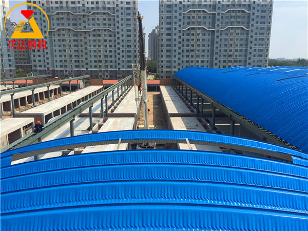 施工前需定制專(zhuān)用的拱形屋頂采光帶,確保尺寸和曲率精準(zhǔn)匹配。組裝過(guò)程中,在每榀拱形屋頂中部安裝兩道角鋼支撐,提高結(jié)構(gòu)穩(wěn)定性。