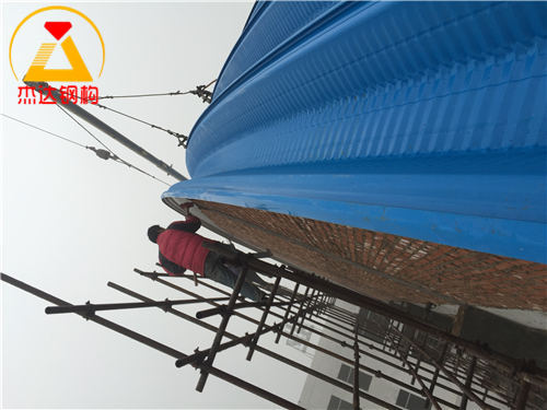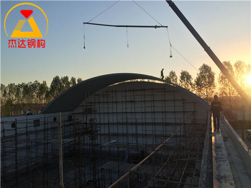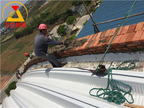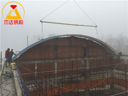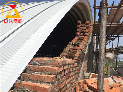 拱形屋頂的磚混結構山墻施工需要土建施工單位和拱形屋頂施工單位的緊密配合。施工過程中,設計拱高尺寸由拱形屋頂施工方提供,土建單位據此預留足夠高度以便后續安裝,保障整體施工質量與進度。