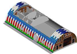 拱形屋頂以0.6-1.5毫米厚的專用彩涂卷板為原料,采用現(xiàn)場壓板、鎖邊、吊裝等工藝形成整體結(jié)構(gòu)。其設(shè)計(jì)簡潔且施工快速,有助于縮短工期并節(jié)約投資成本。此類屋頂結(jié)構(gòu)適合于糧食倉儲、工業(yè)廠房、物流市場及車輛庫房等多種場景。