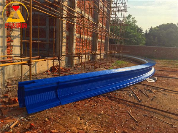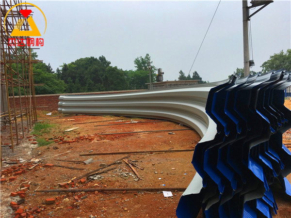 拱形屋頂設(shè)計在跨度和長度上經(jīng)過精準計算,能夠有效承受外部風(fēng)壓和自重。螺紋鋼的采用增強了屋頂?shù)恼w穩(wěn)定性,托板和彩涂卷板的合理搭配進一步提升了抗腐蝕性能和使用壽命。