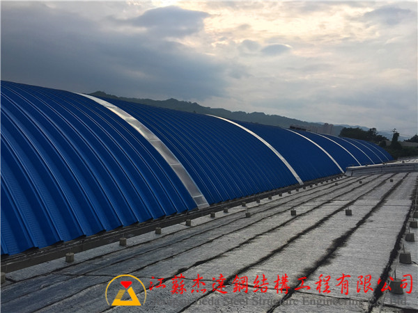 屋面材料選用了厚度為0.8毫米的灰藍色TS320GD-Z高強彩涂卷,具備較好的耐候性和美觀性。彩鋼板通過專用設備加工成型,保證了拱形屋頂的精確度和安裝效率。